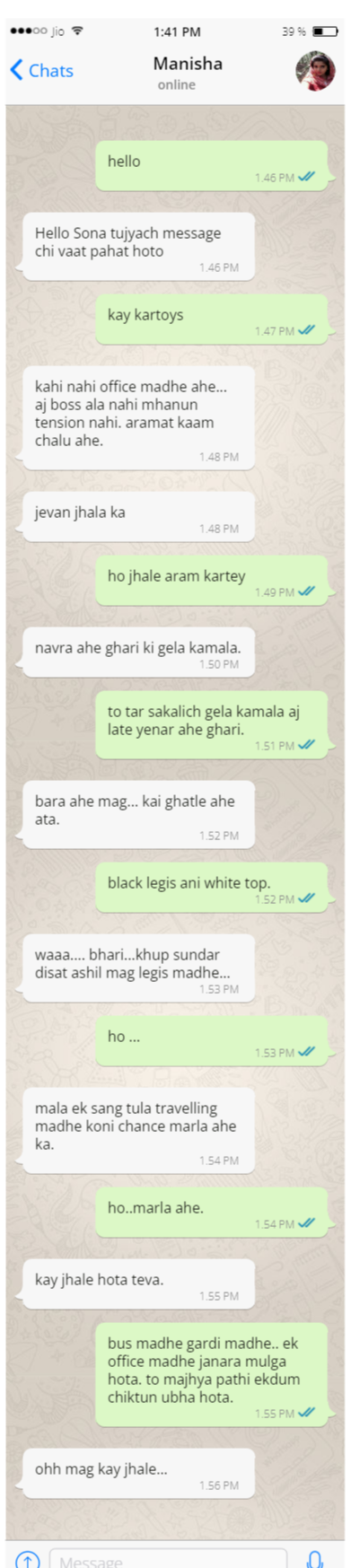 माझ्या एका कथा वाचकाने त्याच्या बायकोची व्हाट्सअँप चाटटींग पाठवली आहे. त्याला तुमची मदत पाहिजे. त्याची बायको दुसऱ्या मुळाशी शारीरिक संभंध ठेवते. तो तिचा जुना बॉयफ्रेंड आहे. गेल्या आठवड्यात त्याची बायको बॉयफ्रेंड बरोबर रूम वर जाऊन आली. आता नवऱ्याला कळत नाही आहे कि त्याने ह्या परिस्थिती काय केले पाहिजे. खालील चाटटींग वाचून तुम्ही आपले मत मांडा.